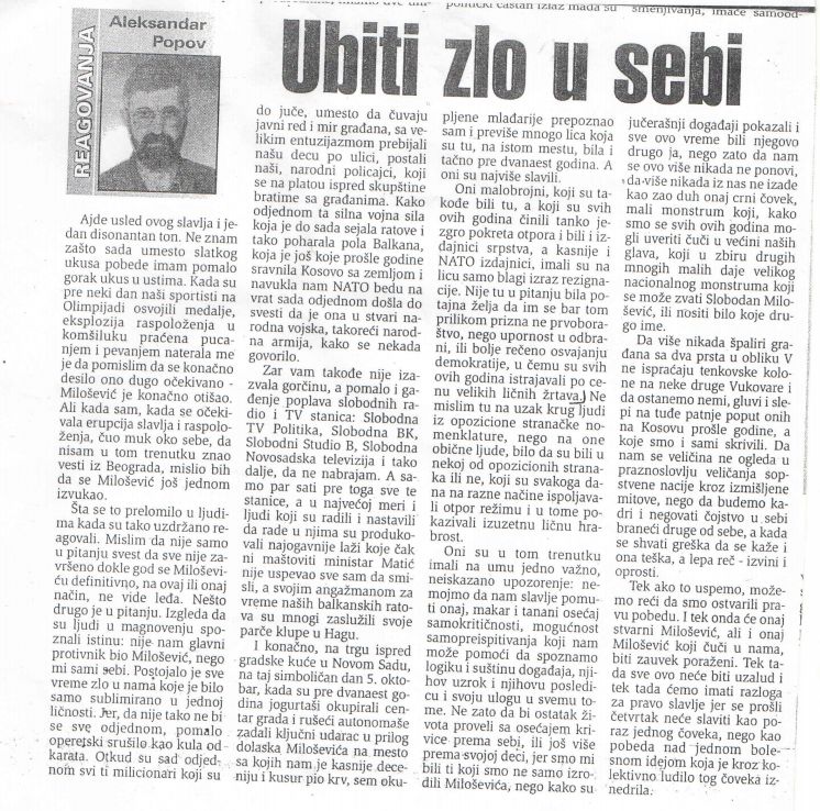 Tek ako to uspemo, možemo reći da smo ostvarili pravu pobedu. I tek onda će onaj stvarni Milošević, ali i onaj Milošević koji čuči u nama, biti zauvek poraženi. Tek tada sve ovo neće biti uzalud i tek tada ćemo imati razloga za pravo slavlje jer se prošli četvrtak neće slaviti kao poraz jednog čoveka, nego kao pobeda nad jednom bolesnom idejom koja je kroz kolektivno ludilo tog čoveka iznedrila.