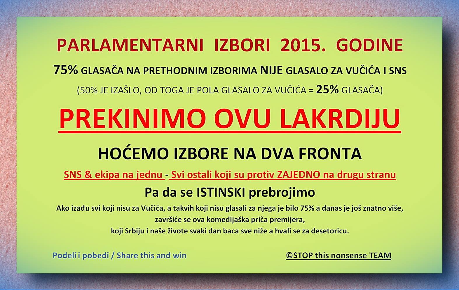 Internetom poslednjih dana kruži plakat-apel u kojem se građani pozivaju da prekinu ovu lakrdiju od vlasti. Organizacija koja se predstavlja kao Tim “Stop besmislu” (Stop This Nonsense Team) ispravno poručuje da 75 odsto građana Srbije nije glasalo za SNS i za Vučića. Matematika je jednostavna: na izbore je izašlo 50 odsto punoletnih građana, od čega je polovina glasala za Vučića. Dakle, od ukupnog broja birača za SNS je glasalo njih svega 25 odsto.