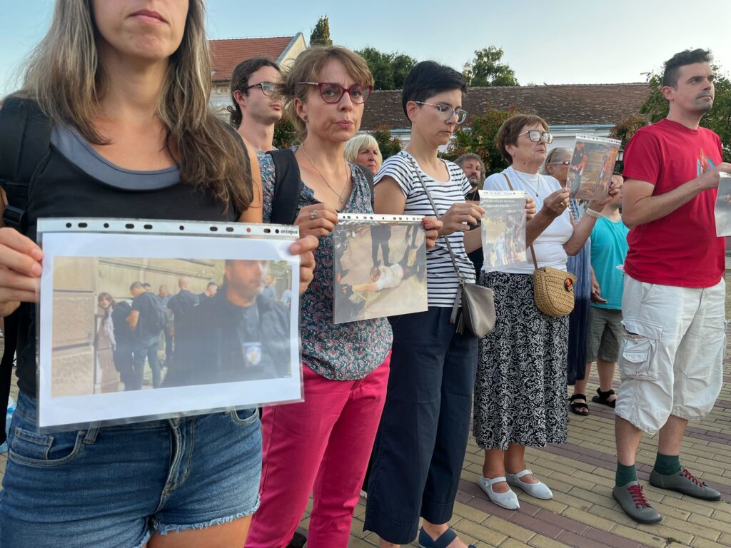 Protestni skup u Bečeju je počeo na centralnom trgu u 19 sati, a demonstranti u rukama drže fotografije policijskog nasilja i žrtava nasilja – dok se sa zvučnika emituje audio kompilacija pod nazivom „dva paralelna sveta“, tonski inserti, kako su demonstranti naveli, žrtava režima – kao i funkcionera vladajuće stranke i njihovih koalicionih partnera.