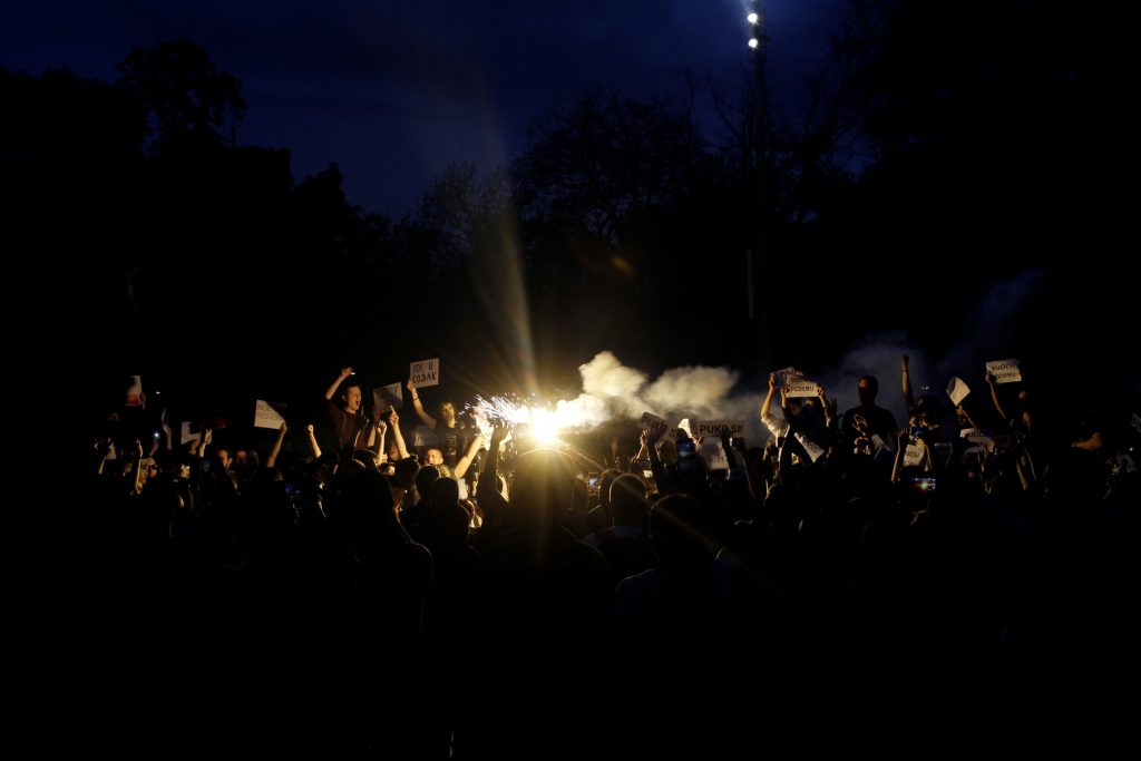 Učesnici protesta su prethodno, posle šetnje centralnim gradskim ulicama Beograda, došli do zgrade skupštine, a prema policajcima je poletelo nekoliko plastičnih flašica za vodu.