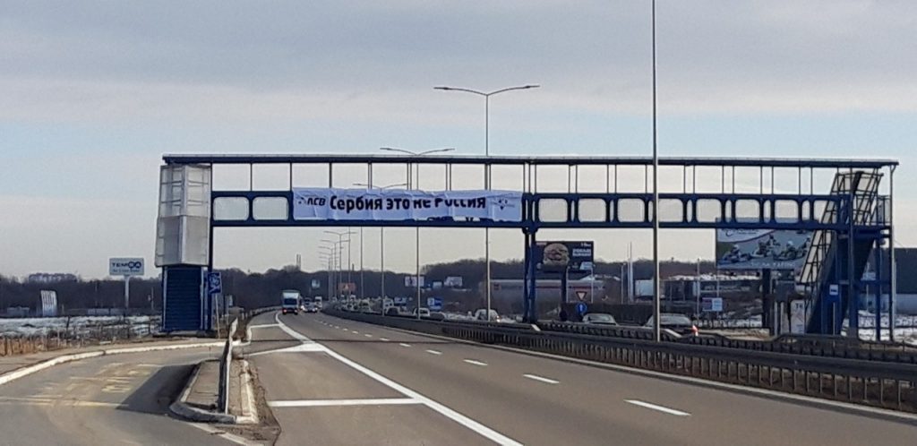 Radi se o baneru na ruskom „Srbija nije Rusija“ koji su u zajedničkoj akciji iznad autoputa okačili aktivisti Lige socijaldemokrata Vojvodine i Vojvođanske partije, a koji je na putu sa aerodroma „Nikola Tesla“ u prestonicu trebao da primeti pre svega ruski predsednik Putin.