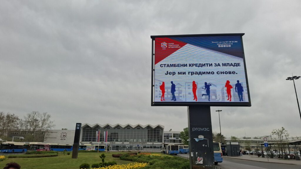 Na elektronskom bilbordu emituje se poruka Poštanske štedionice o kreditima za mlade “Stambeni krediti za mlade. Jer mi gradimo snove”, uz siluete osoba, kuća i stanova.