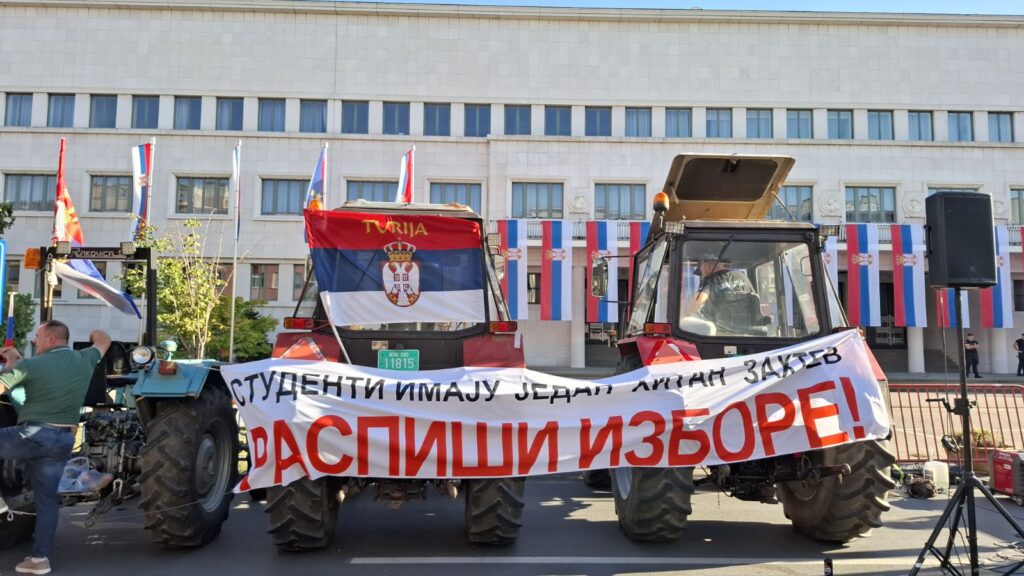 Njima su podršku dali i studenti, pa je na traktore okačen vleiki transparent koji je viđen i na jučerašnjem protestu. Na njemu piše: „Studenti imaju jedan hitan zahtev – raspiši izbore!“.