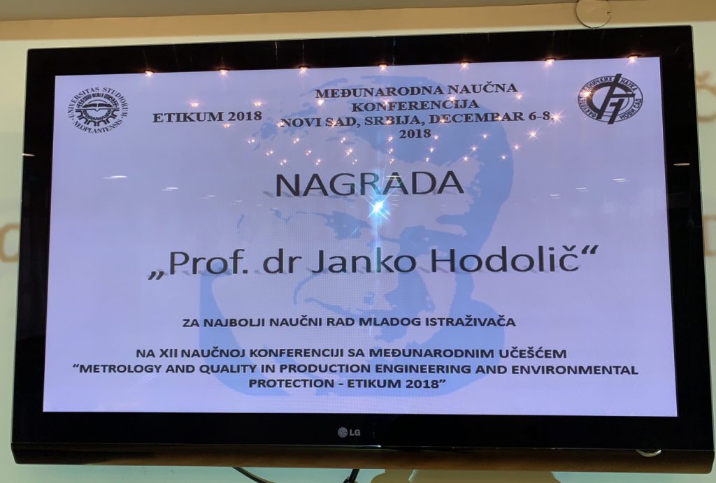 Nagrada se dodeljuje najboljem mladom istraživaču do 35 godina starosti, u okviru Međunarodne naučne konferencije „Etikum 2018“, koja se ove godine održava po 12. put i nosi naziv „Metrologija i kvalitet u proizvodnom mašinstvu i zaštiti životne sredine“.