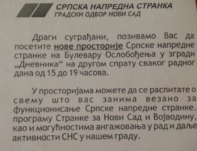 „Samo u središnjem delu Bulevara oslobođenja, stranka Aleksandra Vučića je zakupila tri lokala, a istorijski i do sada neviđen slučaj drskosti i bahatosti predstavlja njihovo useljenje u prostorije jedinog dnevnog lista na srpskom jeziku u Vojvodini – Dnevnika“, piše u saopštenju.