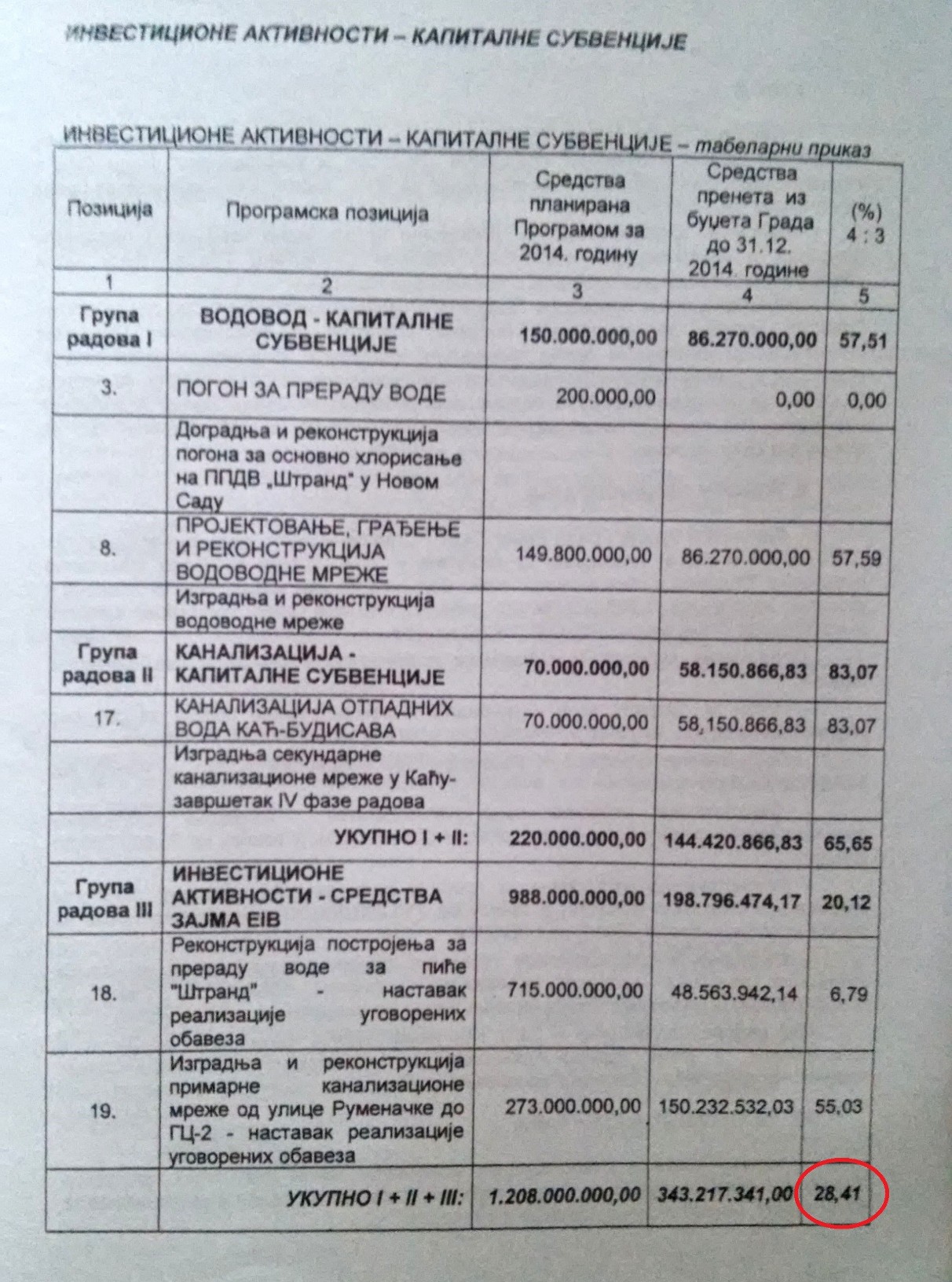 DS je naveo da je JKP Vodovod i kanalizacija u 2014. utrošio samo 28,41 odsto sredstava predviđenih za investicije u vitalnim tehničkim sistemima i ocenio da to “na više nego ubedljiv način pokazuje koliko je gradska vlast nesposobna i nezainteresovana za razvoj grada”.