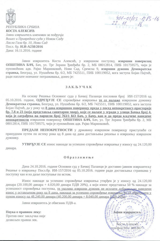 Pokrajinski odbor Demokratske stranke saopštio je da je lokalna vlast u opštini Bač, koju predvodi SNS, danas uz pomoć izvršitelja siledžijski obila prostorije DS u toj opštini, iako se presuda na koju su se pozivali ne odnosi na prostorije u kojima je Opštinski odbor DS već deset godina.