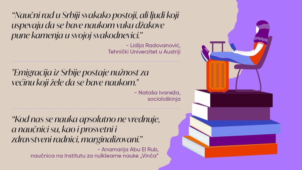 Iskustva naših sagovornica ukazuju da je, s jedne strane, nauka u Srbiji na svetskom nivou, s obzirom da su naučnici sa naših prostora prihvaćeni u inostranstvu, ali, s druge, da naša država ne omogućava uslove za rad i mogućnost napredovanja u nauci. To je, kako i sami potvrđuju, suštinski problem koji koči naše naučnike i tera ih da doprinose svojim radom drugim zemljama.