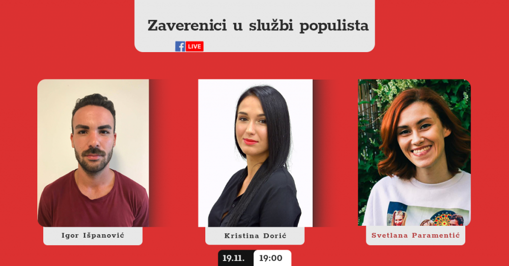 Nezavisno društvo novinara Vojvodine emitovaće novu onlajn emisiju “Zaverenici u službi populista” u četvrtak, 19. novembra, u 19.00 časova, posvećenu opasnostima širenja teorija zavere u medijima i na društvenim mrežama.