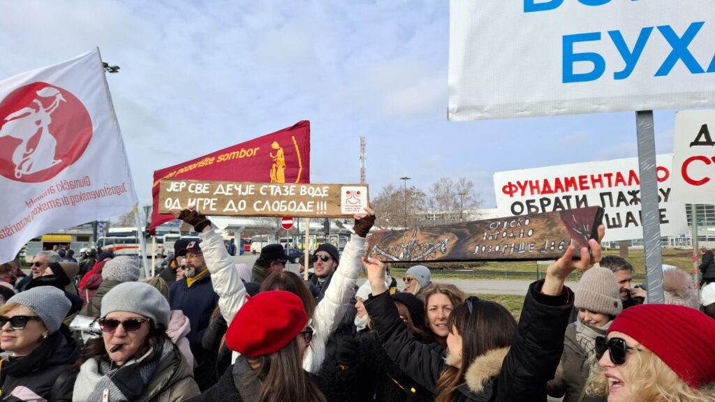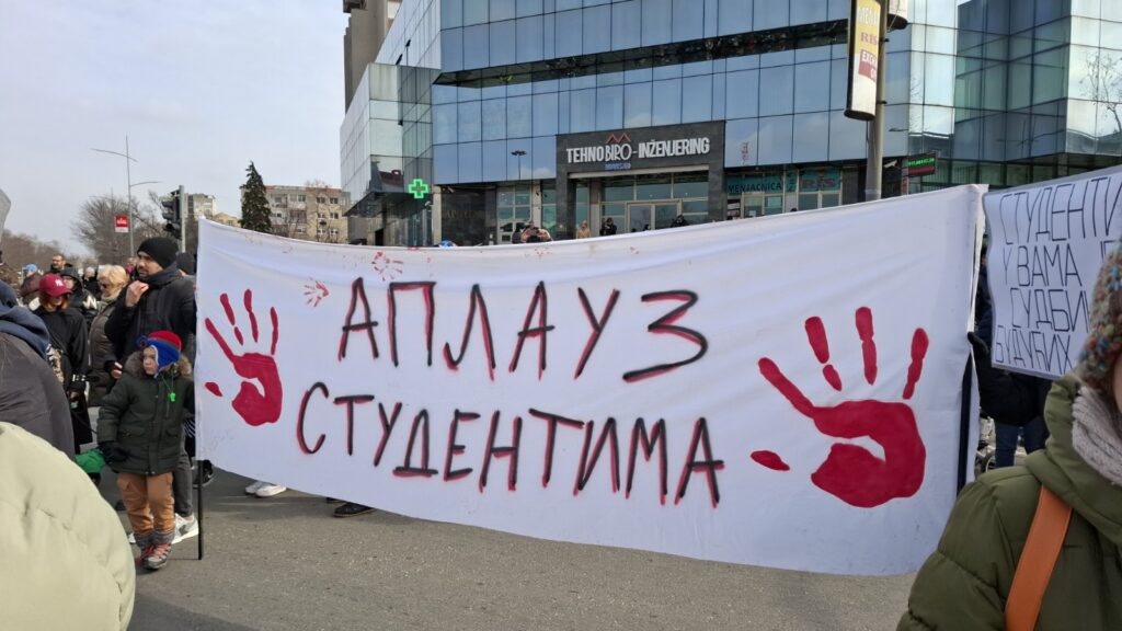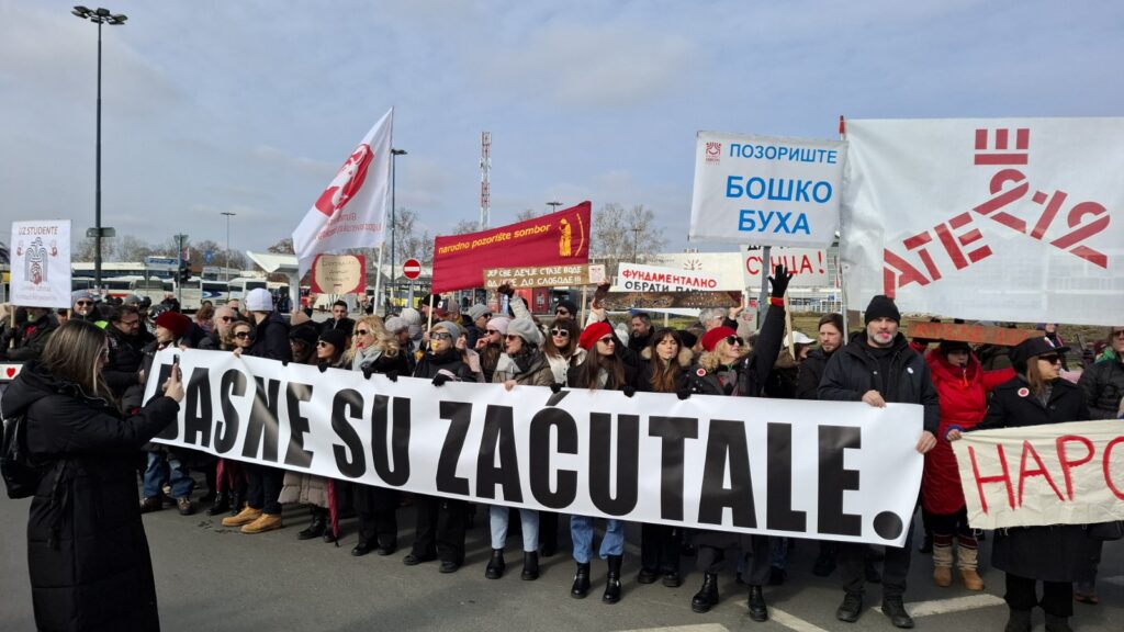 Protest je počeo blokadom raskrsnice kod Železničke stanice i 15-minutnim ćutanje u znak sećanja na 15 žrtava tragedije, u Novom Sadu danas je počeo protest “Pozorište na ulici – Daske su zaćutale”.