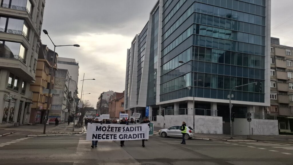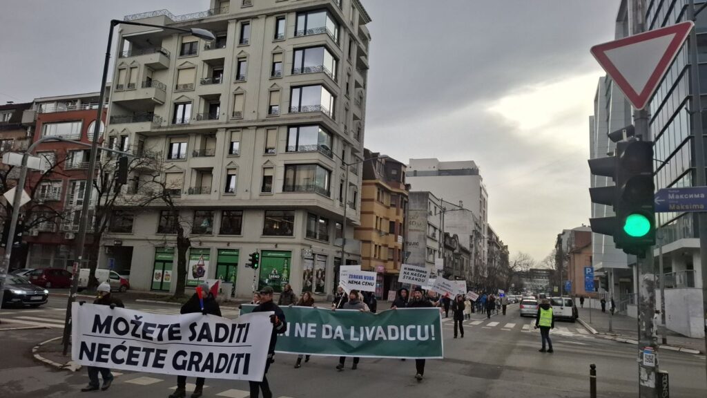 Građani su se okupili jutros na livadici na kojoj gradske vlasti planiraju izgradnju crkve a čemu se oni protive. Odatle su krenuli u protestnu šetnju do Skupštine grada.