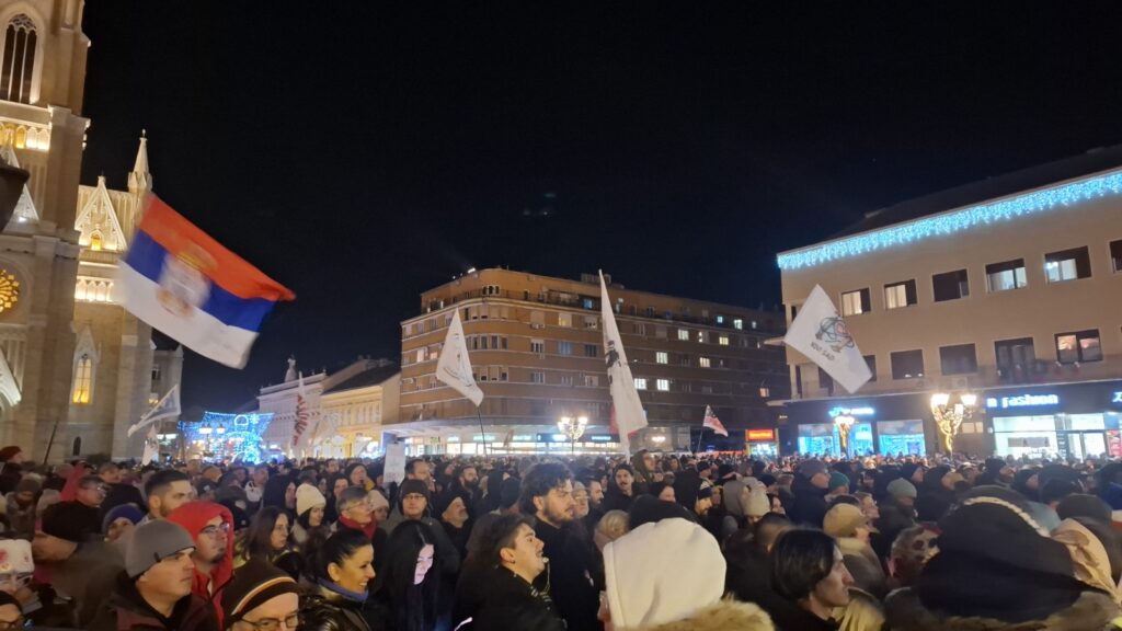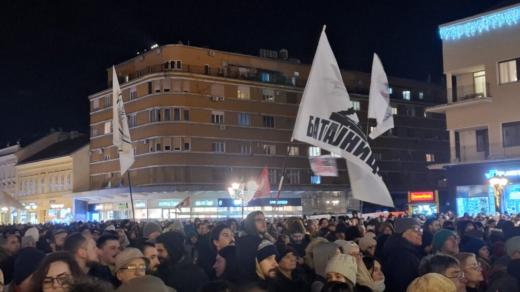 Okupljeni su nosili zastave gradova iz kojih su došli i otisak krvave šake, simbol studentskih protesta koji su počeli nakon pada nadstrešnice novosadske železničke stanice 1. novembra 2024. godine, kada je poginulo 16 ljudi.