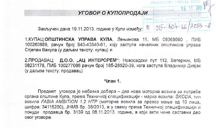 Precizna je bila i opština Kula, koja je u novembru prošle godine sklopila ugovore u vrednosti od 1,8 miliona dinara. U pitanju su dve Škode Fabije Ambition za potrebe opštinske uprave.