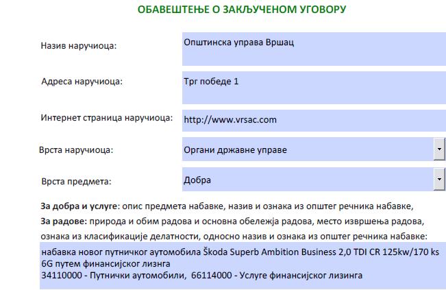 U pitanju je nabavka nove Škode Superb Ambition Business 2,0 TDI putem finansijskog lizinga.