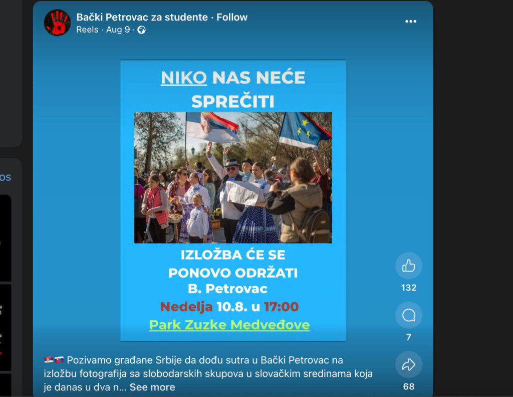 “Pozivamo građane Srbije da dođu sutra u Bački Petrovac na izložbu fotografija sa slobodarskih skupova u slovačkim sredinama koja je danas u dva navrata NASILNO prekinuta. Niko nas neće sprečiti”, stoji u pozivu.