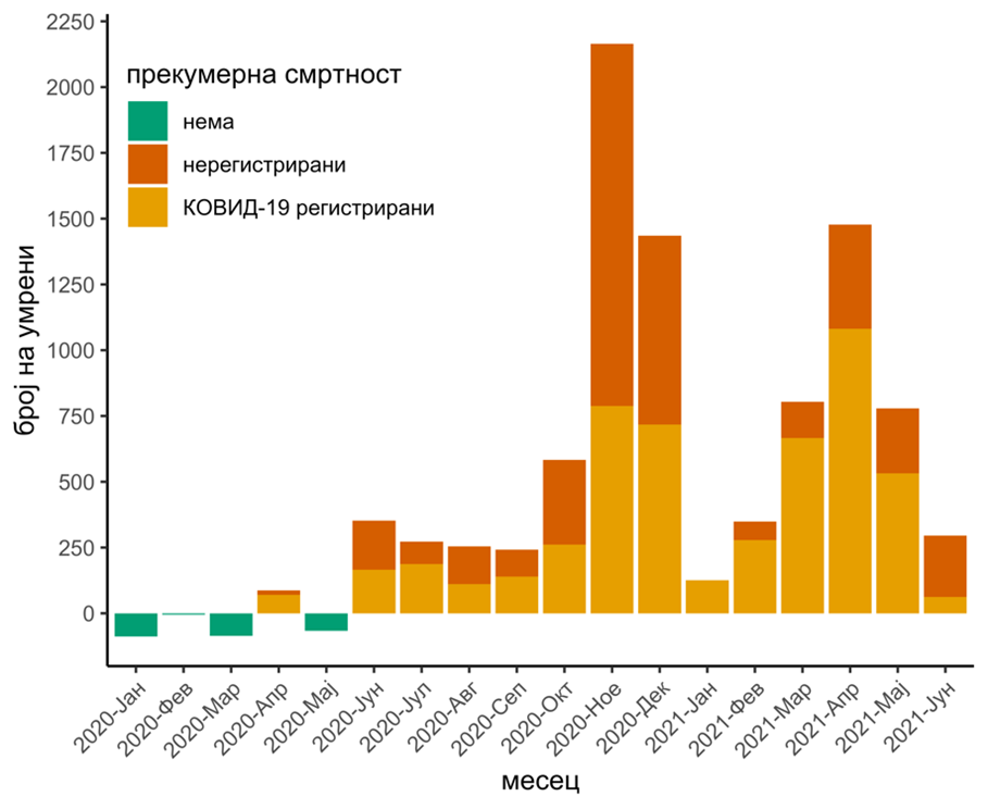 Do 5. oktobra registrovani su oko 6.700 smrtnih slučajeva zbog KOVID-19 u Makedoniji, koja je jedna od zemalja sa najvećom smrtnošću od KOVID-19 na milion žitelja u svetu. Pored njih, imamo i ogroman broj neregistrovanih smrtnih slučajeva zbog pandemije. Prema zadnjim podacima Državnog zavoda za statistiku, od početka 2020. do kraja jula 2021. umrlo je 42.062 ljudi. U ovom periodu, prema modelu očekivane smrtnosti, procenjujem da su 32.769 ljudi trebali da umru ukoliko nije postojala pandemija. A to znači da je umrlo oko 9.300 ljudi više u poređenju sa situacijom ako ne postoji pandemija. Dotad, bili su regiistrovani oko 5.500 KOVID-19 smrtnih slučajeva – približno 60 procenata od viška umrlih (vidi Grafikon 2).