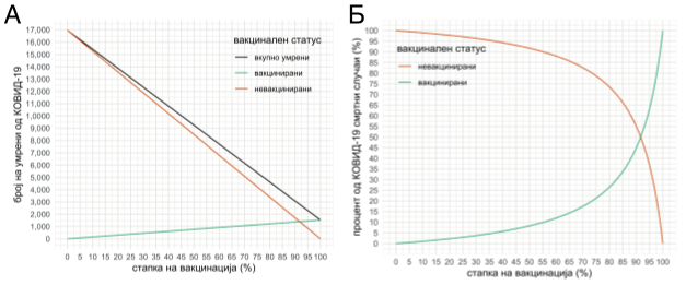Grafikon 3. Model broja sprečenih smrtnih slučajeva od KOVID-19 u Makedoniji pomoću vakcinacije. A. Međusobni odnos između stope vakcinacija i broja umrlih zbog KOVID-19. B. Međusobni odnos između stope vakcinacija i zastupljenosti vakcinisanih među umrlim od KOVID-19. Napomena: Procena je prema pretpostavkama modela o broju sprečenih smrtnih slučajeva. 1. Cela populacija da bude izložena SARS-CoV-2; 2. Smrtnost da bude zasnovana na procenama prema starosnim grupama iz Verity et al. (2020); 3. Efektivnost vakcina u sprečavanju smrtnog ishoda da bude 90 posto; 4. Građani da budu vakcinisani pred da budu izloženi virusu; 5. Populacija da je 1,83 miliona, prema zadnjim podacima iz DZS.