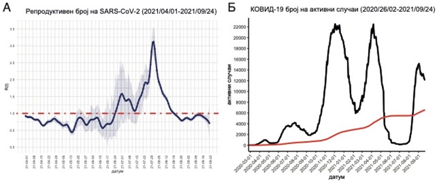 U toku je četvrti talas KOVID-19. Iako smo naizgled ostavili pik iza sebe, kao što na to ukazuje pad u reproduktivnom broju i postepeni pad broja aktivnih slučajeva (vidi Grafikon 1), epidemiološko stanje i dalje je nestabilno i postoji rizik da se talas razvuče ili da se pojavi novi talas kasnije u toku ove jeseni ili zime.
