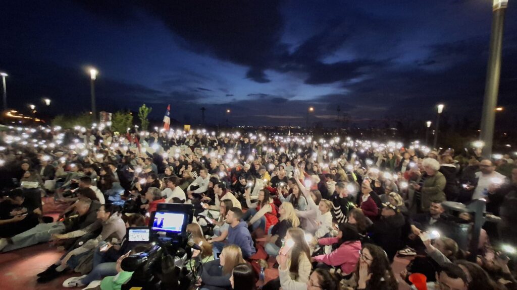 Pošto ni RTV ni RTS ne emituju uživo doček u Strazburu, građani ispred RTV-a prenos prate preko video bima na kojem se emituje prenos sa studentske platforme Blokada.info.