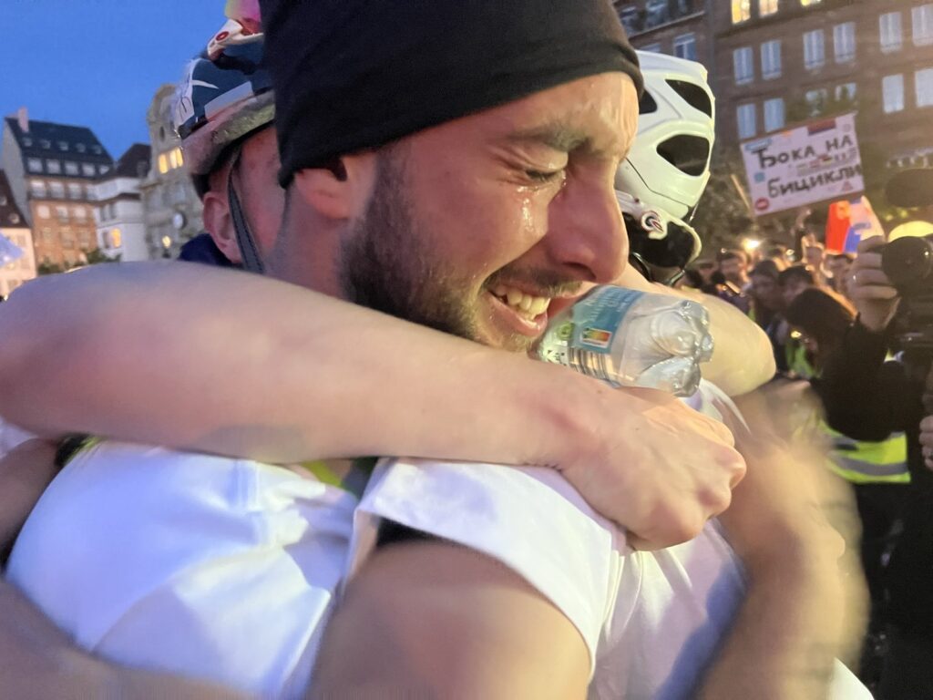 Okupljeni su euforično uzvikivali „Pumpaj“ u momentu ulaska biciklista na glavni trg u Strazburu. Potom su usledili zagrljaji, suze i poljupci, a onda i pesma biciklista.
