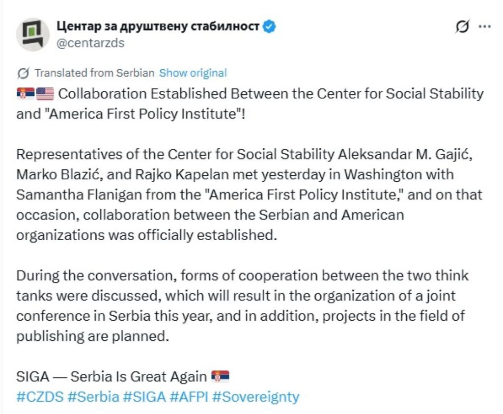 Na konferenciji su sudjelovali i članovi novosadskog Centra za društvenu stabilnost. Oni su se s događaja pohvalili početkom suradnje s najvažnijim trumpističkim think-tankom America First Policy Institute (AFPI), organizacijom čije je članove Trump imenovao na čelne pozicije u državnom odvjetništvu, CIA-i, FBI-u, ministarstvima poljoprivrede, obrazovanja i zaštite okoliša. U skladu s destruktivnom ideologijom trumpizma, zadnjih godinu dana oni rade na uništavanju institucija koje vode. Iz Centra su najavili da će ove godine s AFPI-om organizirati zajedničku konferenciju u Srbiji.