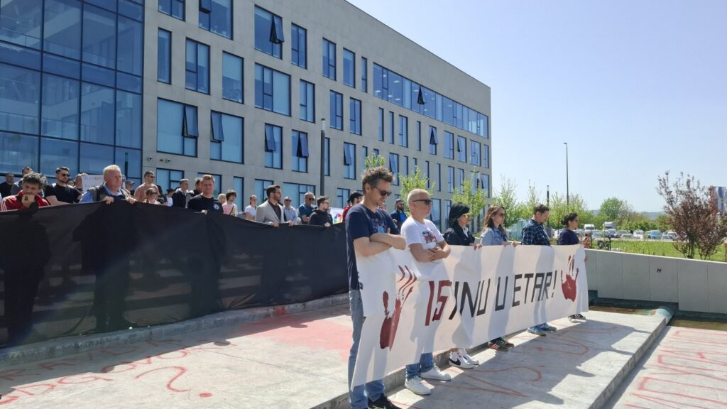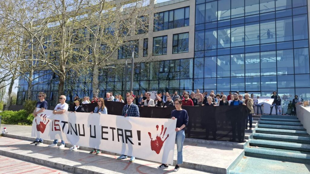 Zaposleni u RTV-u su držali veliki crni flor, kao i transparent s porukom “Istinu u etar!”, sa krvavim šakama.