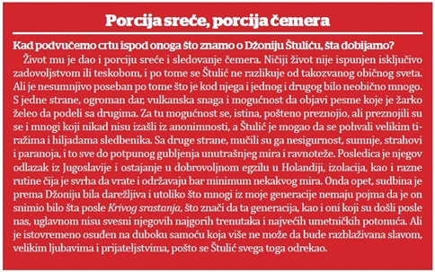 Dakle, u jugoslovenskoj rok muzici – i popularnoj muzici uopšte jer tu su i šansonjeri Arsen Dedić i Đorđe Balašević – javili su se ljudi čije pesništvo možemo smatrati veoma ozbiljnim. Ali ipak se čini da niko od njih – čak ni Bregović, koga je Štulić smatrao jedinim konkurentom –u svojim stihovima nije pokazao toliko pronicljivosti i inteligencije, toliko sposobnosti za širok i istovremeno britak zahvat, a ni takvu veštinu u kombinovanju tradicionalnog i modernog, koliko svega toga ima u najboljim Štulićevim stihovima.