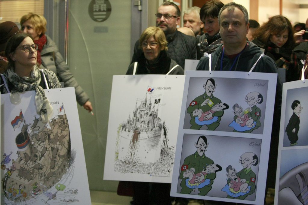 Izložba i skup podrške karikaturistima Petričiću i Koraksu
