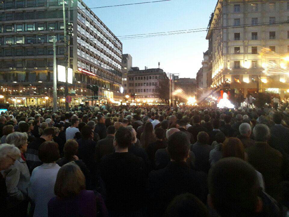 Oko 20.000 okupljenih građana prekidalo je Jankovićevo obraćanje skandiranjem „Pobeda, pobeda“ i paljenjem navijačkih baklji.