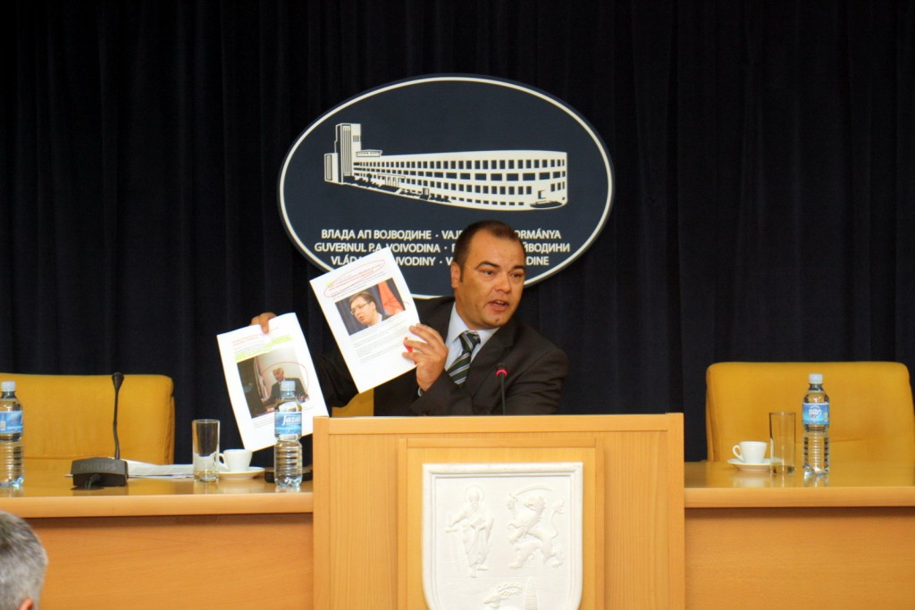 On je ranije danas na konferenciji za novinare, držeći novinsku fotografiju Aleksandra Vučića, upitao prvog potpredsednika Vlade Srbije da li se državna politika vodi tako što „pretimo, vičemo, pravimo rijaliti šou od vlade“.