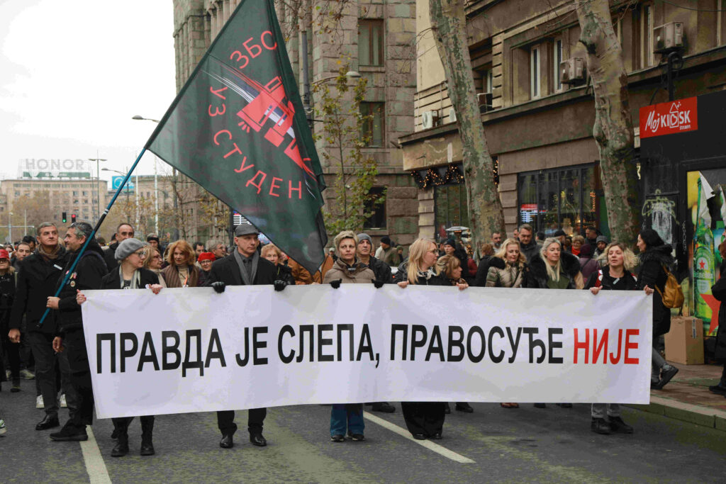 Protest je počeo intoniranjem himne Srbije, a na centralnom transparentu-šetalici piše „Pravda je slepa, pravosuđe nije“.