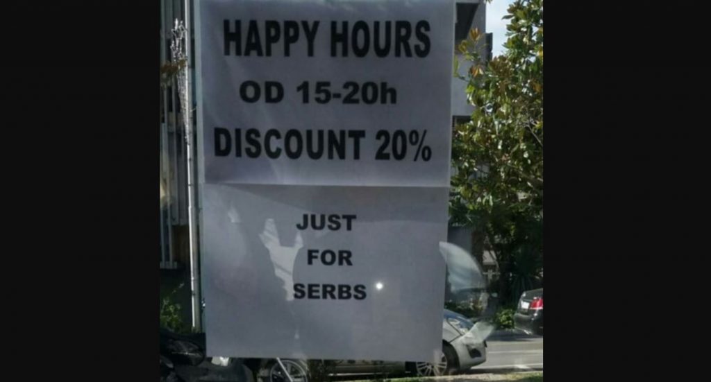 „Kao rođeni Tivćani i ljudi koji su od malih nogu vaspitavani da smo u ovom gradu, ovoj državi, na ovom svijetu svi isti, bez obzira na to kako se ko zvao ili osjećao, prvenstveno osjećamo tugu i sramotu zbog slike koju danas naš grad, Tivat, šalje. Naime, na vratima jednog ugostiteljskog objekta osvanuo je natpis „HAPPY HOURS OD 15-20h DISCOUNT 20% JUST FOR SERBS“. U tom smislu, prvenstveno pozivamo nadležne institucije da djeluju na evidentno kršenje Zakona o zabrani diskriminacije, cijeneći da je sada, više nego ikad, potrebno smiriti strasti, spustiti tenzije, a Tivat, naš grad, pustiti da bude ono što je uvijek bio – topli dom za sve koji u njemu žive i dobar domaćin za sve koji u njega dolaze“, naveli su iz SD-a.