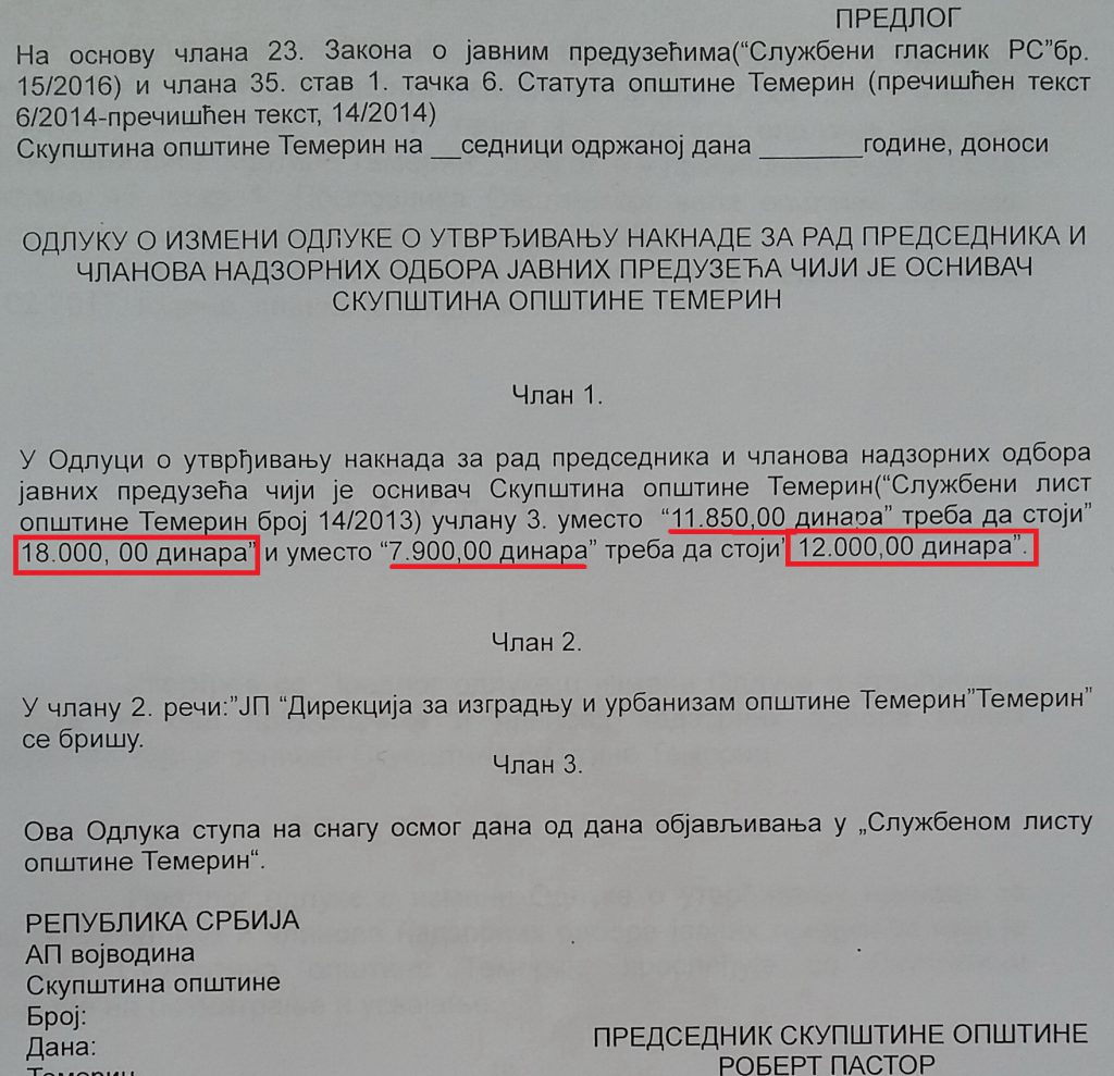 „Nakon nedavnog povećanja plata na poziciji temerinskog predsednika Skupštine Pastor Roberta iz redova SVM od 110 procenata i drastičnog povećanja odborničkih plata za preko 50 procenata usledio je i novi udar na budžetska sredstva opštine Temerin. Zaključkom i predlogom odluke koji su za 14. sednicu SO Temerin potpisali predsednik opštine Đura Žiga (SNS) i Pastor Robert (SVM), predviđeno je da skupštionska većina koju čine SNS/SPO/SVM i SPS izglasa nova povećanja od preko 50 procenata za mesečne naknade članovima nadzornih odbora čiji je osnivač opština“, izjavio je za Autonomiju šef odborničke grupe „Zajedno za naš Temerin“ Robert Karan.