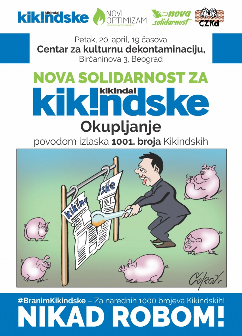 U CZKD-u su se, u organizaciji Novog optimizma, okupili prijatelji i poštovaoci Kikindskih, predstavnici lokalnih medija i pokreta, koji su u podjednako nezavidnom položaju kao i taj nedeljnik, kako bi poslali poruku skupa “NIKAD ROBOM!”.