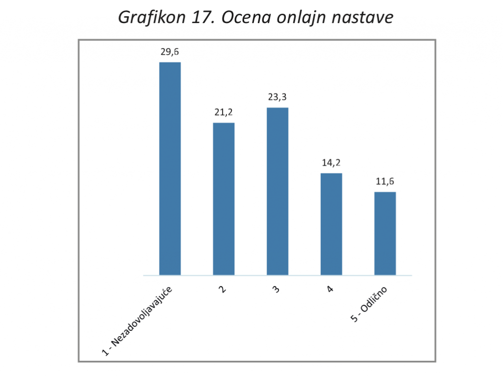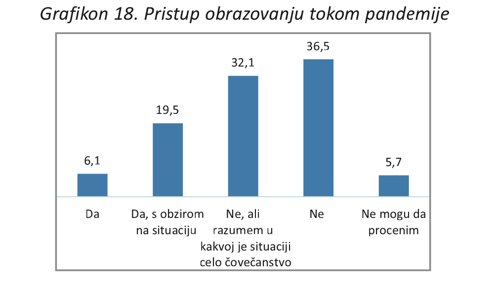 Istraživanje “ŽIvot mladih u Srbiji: Uticaj KOVID19 pandemije”, koje je Krovna organizacija mladih Srbije (KOMS) sprovela od avgusta do oktobra 2020. godine, pokazalo je ovo nezadovoljstvo i u brojkama. Kako se navodi u istraživanju, oko 60 odsto mladih je istaklo da pandemija negativno utiče na njihovo obrazovanje, a veliki deo njih (jedna četvrtina) nije ni imala pristup obrazovanju kada su se promene desile. To su najčešće bili mladi koji žive u mestima manjim od 10.000 stanovnika.