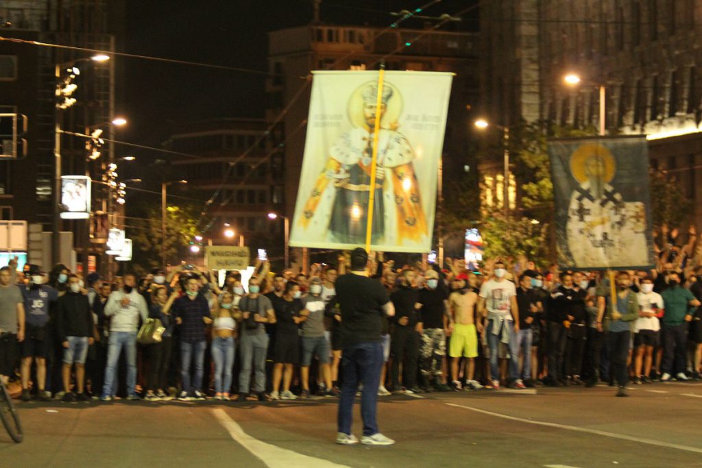 Oko 22 časa okupilo se ponovo nekoliko stotina demonstranata ispred Skupštine Srbije, noseći veliki drveni krst i zastave s likovima srpskih svetaca.