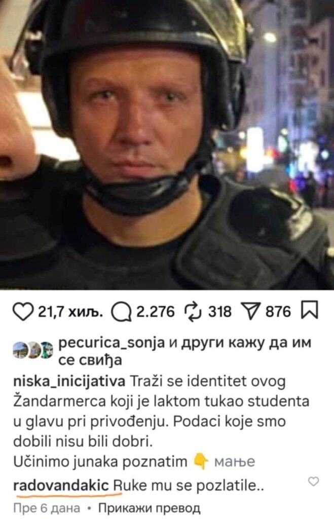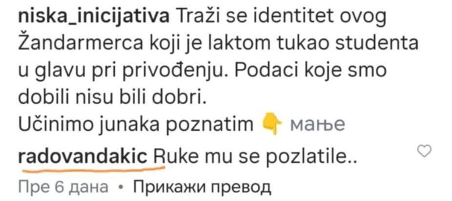 "Radovan Dakić je opravdavao brutalno prebijanje naše sugrađanke, studentkinje Medicinskog fakulteta, a za žandarma koji je laktom tukao studenta je napisao: ‘Ruke mu se pozlatile’”