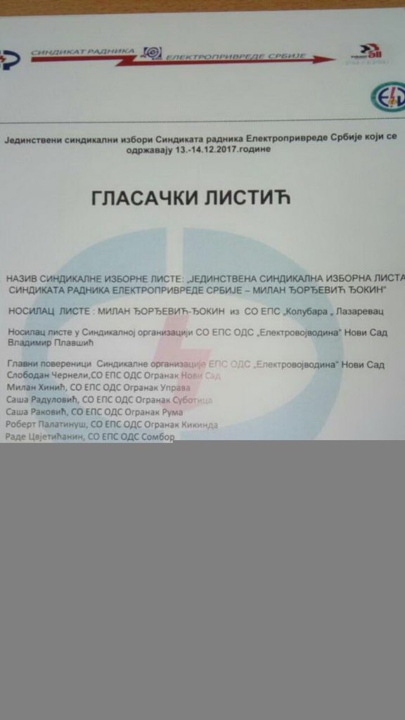 Na spornim izborima učestvuje samo jedna jedistvena lista koju predvodi aktuelni predsednik Sindikata EPS-a Milan Đorđević Đokin. Na listiću u Vojvodini nosilac liste je smenjeni predsednik Sindikata Elektrovojvodine Vladimir Plavšić i osam predstavnika elektrodistribucija Subotica, Ruma, Kikinda, Sombor i Senta.