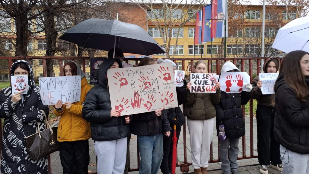 Maturanti ove škole stajali su ispred školske ograde zgrade u ulici Braće Ribnikar. U rukama su držali transparente sa porukama „Mislim=postojim zato ovde stojim“, „Ja hoću život, bolji život“, „Marići ne ćute“, „korupcija ubija“, „Ruke su vam krvave“ i simbolom ovih protesta – otiskom krvave ruke.