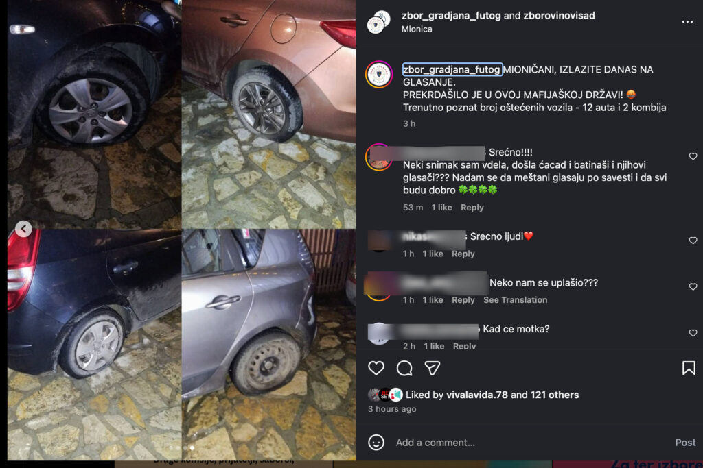 Zbor građana Futog objavio je da su u Mionici noćas oštećena vozila Novosađana koji su došli da prate današnje lokalne izbore u toj opštini.