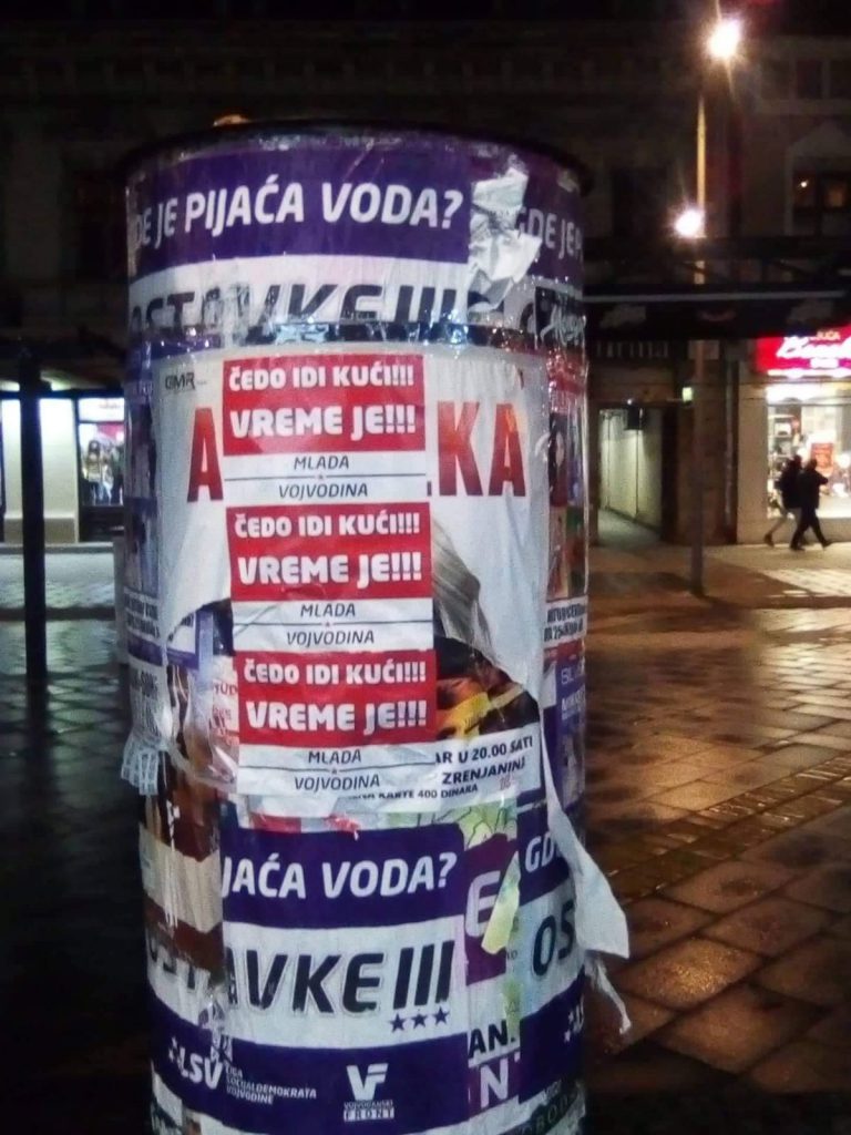 “Čedo, idi kući, vreme je!”, piše na crveno-belim plakatima, koji su osvanuli jutros. Potpisani su sa “Mlada Vojvodina”.