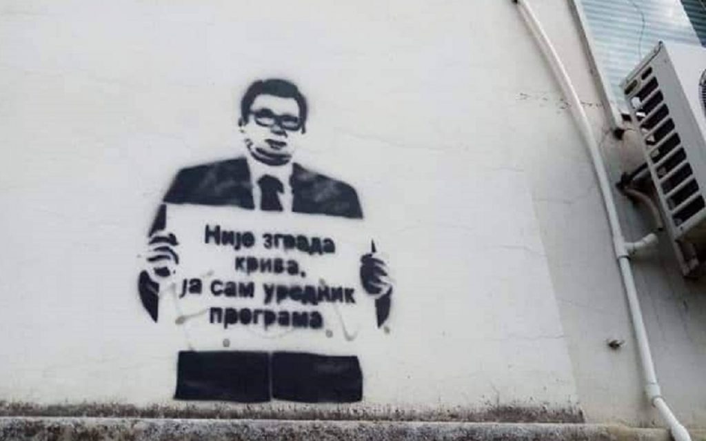 Na fasadi zgrade Radio-televizije Vojvodina jutros je osvanuo grafit na kom je nacrtan predsednik Srbije Aleksandar Vučić koji u ruci drži parolu na kojoj piše: „Nije zgrada kriva, ja sam urednik programa“.