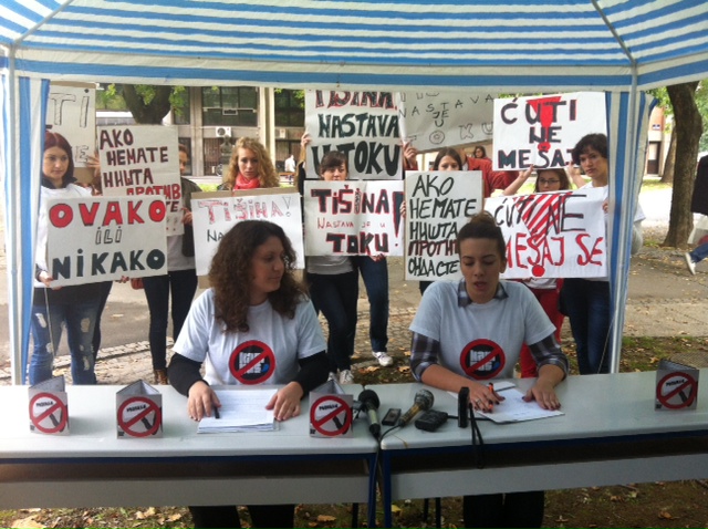 Organizatori su novinarima podelili progam festivala koji je poništen znakom zabrane, a u vreme konferencije za novinare oni su nosili transparente “Tišina, nastava u toku”, “Ćuti, ne mešaj se”, kao i majice koje simbolizuju zabranu festivala.