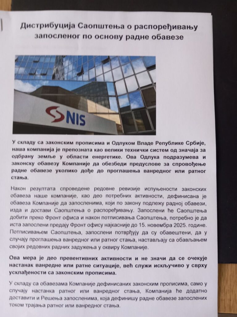 „Zaposleni će Saopštenja dobiti preko Front ofisa i nakon potpisivanja Saopštenja, potrebno je da ista zaposleni predaju Front ofisu najkasnije do 15. novembra 2025. godine. Potpisivanjem Saopštenja, zaposleni potvrđuju da su obavešteni, da u slučaju proglašenja vanrednog ili ratnog stanja, nastavljaju sa obavljanjem svojih redovnih radnih zaduženja u okviru Kompanije“, precizirano je u ovom obaveštenju zaposlenima.