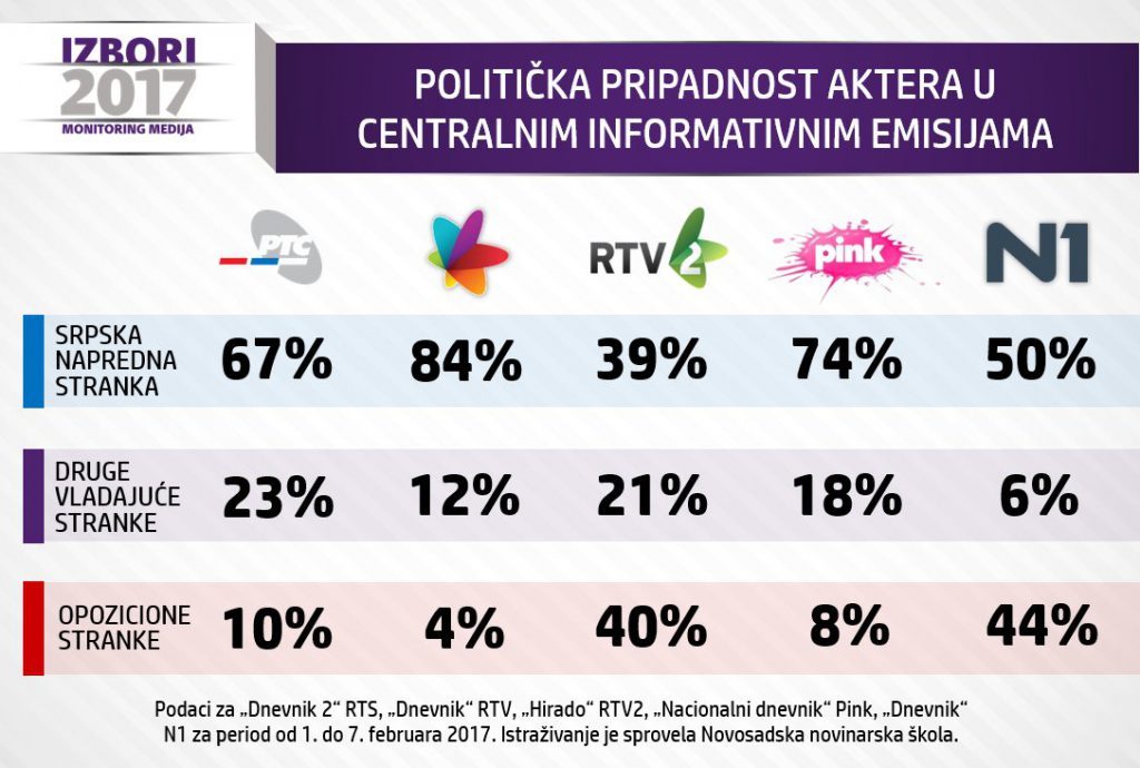 Srpska napredna stranka (SNS) najzastupljenija je u centralnoj informativnoj emisiji na Prvom programu Radio-televizije Vojvodine, u poređenju sa Radio-televizijom Srbije, Pinkom i N1.
