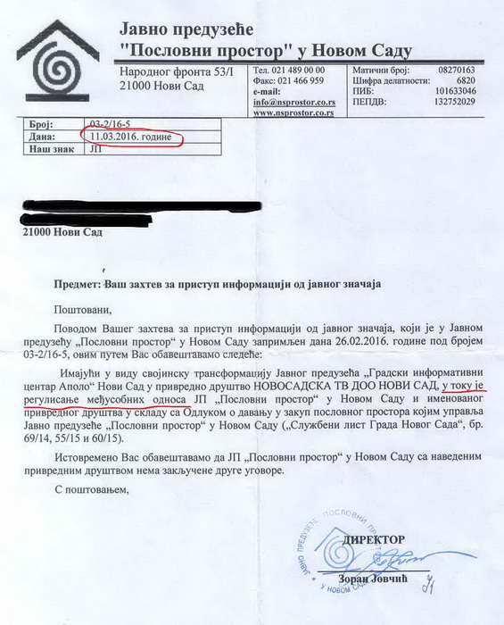 Ta stranka je saopštila da se iz odgovora gradskih vlasti koji su dobili po po zahtevu za pristup informacijama od javnog značaja, vidi da je Novosadska televizija, koja je, kako navode, „privatizovana u septembru 2015. godine pod veoma sumnjivim okolnostima“, i za narednih godinu i po dana dobila besplatno na korišćenje ekskluzivni prostor u strogom centru grada veličine oko 500 kvadratnih metara.