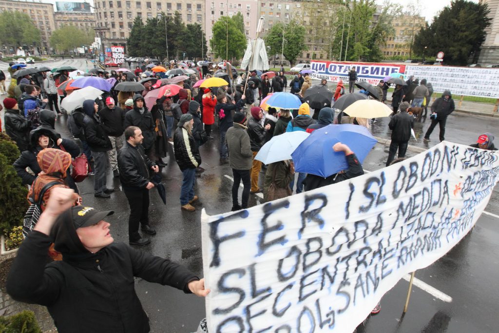 Na čelu kolone, koju su predvodili dobošari, bili su istaknuti transpartenti „Fer i slobodni izbori, sloboda medija, departizacija, decentralizcaija, zaštita i poboljšanje radnih prava“, „Sviraj kraj. Kulturom protiv diktature“, kao i „Protiv terora vlasti“.
