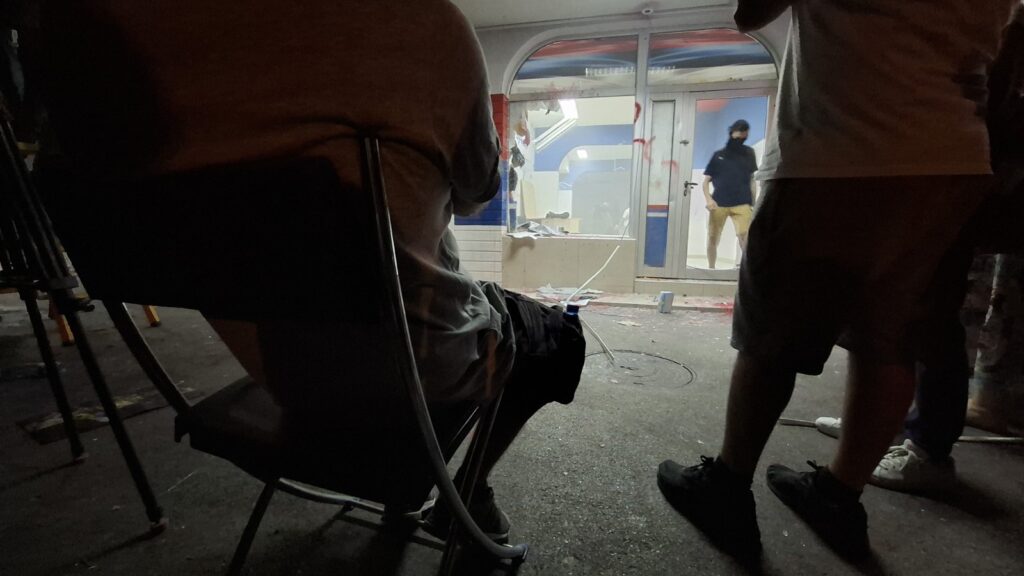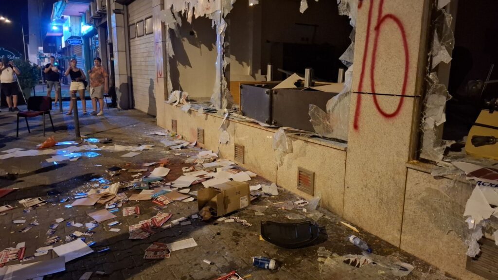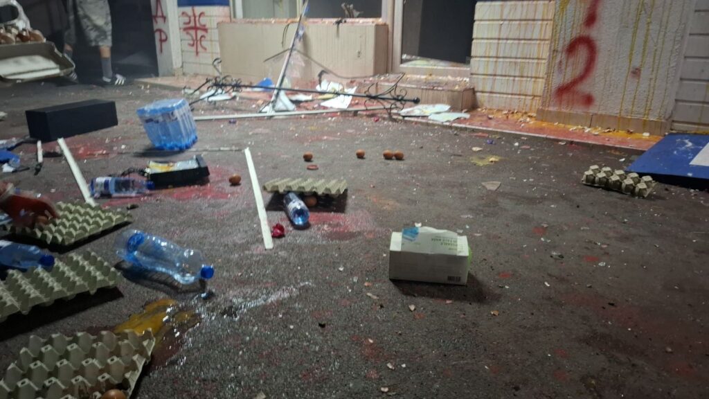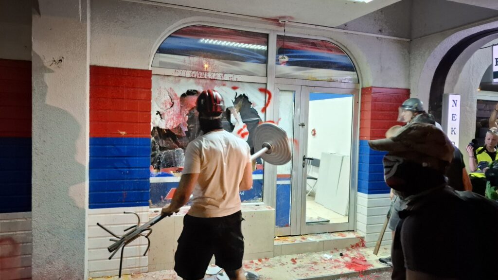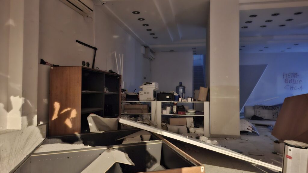 Okupljeni su razlupali izloge i staklena vrata. Iz prostorija su iznosili jaja, vodu i kante sa farbom. Unutrašnje zidove su išarali grafitima i farbom.