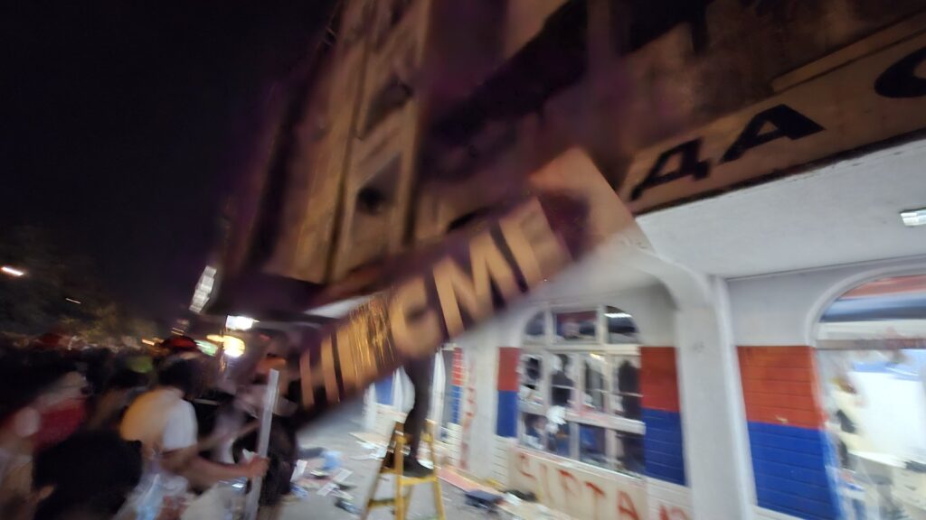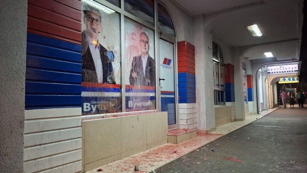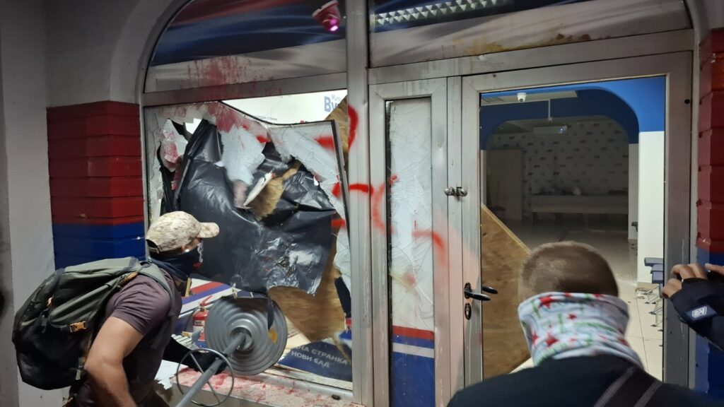 Prvo su demolirane prostorije na Bulevaru oslobođenja. Ispred i iza ovih prostorija juče su bili najveći sukobi pristalica vlasti i građana. Odatle su građani gađani pirotehnikom i kamenjem, a pripadnik Kobri je potegao pištolj.