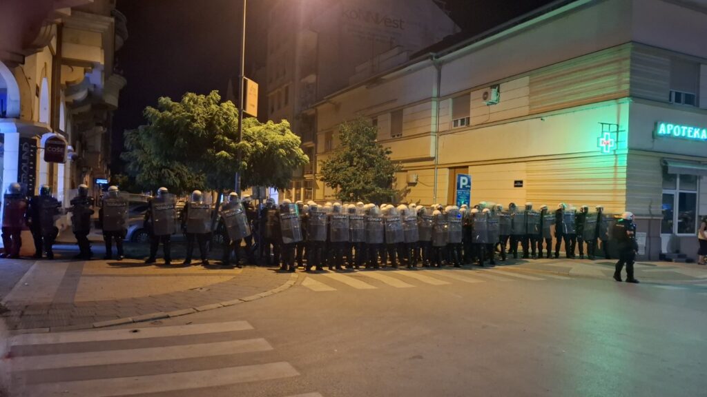 Tada se pojavila policija. Veliki broj policajaca u opremi za razbijanje demonstracija počeo je da potiskuje građane, insistirajući da se raziđu.